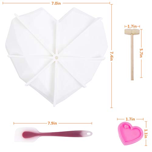 【Lista di imballaggio】 1 pezzo di stampo per torta a forma di cuore di diamanti, 4 pezzi di martelli di legno, 2 pezzi di stampi a forma di cuore per portachiavi e caramelle, 1 pezzo di spatola di silicone