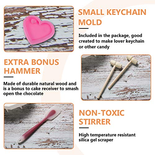 【Multifunzione e facile da usare】 Lo stampo per torta a forma di cuore è perfetto per mousse, cioccolato, torte, cibi preparati, caramelle, fondente ect. I martelli di legno sono perfetti per rompere il cioccolato con un grande regalo sorprendente dentro. La spatola in silicone viene utilizzata per trattenere e pulire la crema e il cioccolato liquido