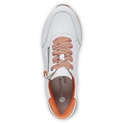 Remonte D1313. White sneakers are a must have in every wardrobe and this design by Remonte with its fresh colour combination of orange and silver ads a pop of colour and gives this sneaker a special charm. Cool and modern with a flexible platform sole, a functional zipper and an easy to wear padded insole make it's the idea sneaker for all your summer needs.