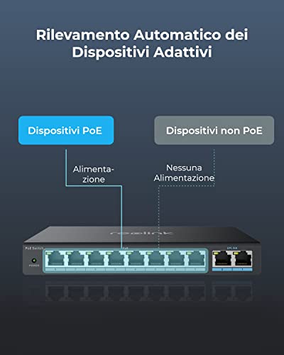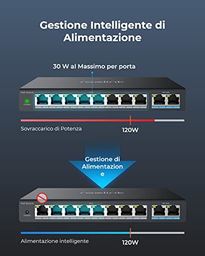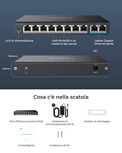Reolink Switch Ethernet con 8 Porte PoE, 2 Porte Uplink Gigabit, fino a 120 W Totali per le Porte PoE, Switch PoE Ideale per NVR Reolink e Telecamere Reolink PoE, IEEE802.3af/at, RLA-PS1