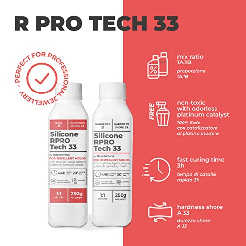 ✔️R PRO TECH 33: Rapporto di miscelazione: 1:1 (sia in volume che peso), resistente alle alte temperature (fino a 350°),indurisce a temperatura ambiente e gli stampi realizzati durano a lungo nel tempo e sono ottimi per colare resine, cera, gesso, cemento e altri materiali. soprattutto nel settore orafo professionale.