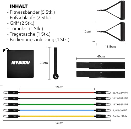 Materiali di alta qualità: le nostre fasce elastiche sono realizzate in lattice naturale e quindi estremamente elastiche, durevoli e rispettose dell'ambiente e allo stesso tempo non dannose per la salute. I manici rivestiti in schiuma sono antiscivolo e traspiranti, proteggono le mani meglio rispetto alle tradizionali fasce da allenamento. Le fibbie in acciaio inox sono forti e durevoli e garantiscono un allenamento sicuro. L'ancoraggio per porta integrato è spesso e morbido e non danneggia le porte.
