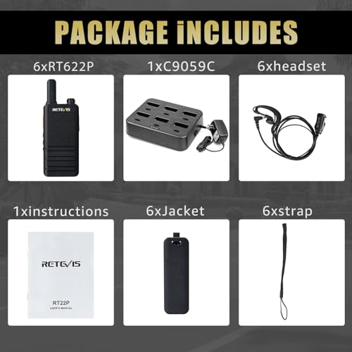 Retevis RT622P Walkie-Talkie Professionali, Ricetrasmittenti Ricaricabile, con Caricatore a 6 vie, 1620 mAh, 15 mm, Ultra Sottile, VOX Walkie Talkie con Auricolari per la Scuola (6 Pezzi, Nero)