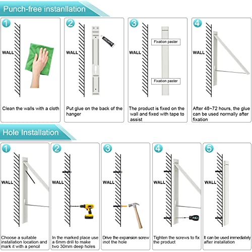EASY INSTALLATION:We provide you with two installation methods, if you install the drying rack on the door, glass, tile wall and other smooth walls, you do not need to punch, we provide you with nail free glue. If you want to mount a folding hanger on a lime wall, we provide you with two screws.