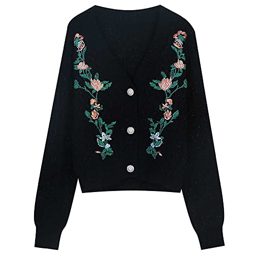 Retro Autunno Inverno Nuovo Industria Pesante Fiore Ricamo Moda Sciolto V-Collo A Maglia Cardigan Cappotto, nero, M