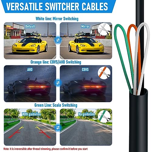 【Tre cavi di taglio】: Universale Auto Retrocamera è dotato di tre cavi commutabili per aumentare la comodità d'uso, il cavo bianco può commutare lo specchio (vista posteriore) in non specchio (vista anteriore), il cavo arancione può commutare il segnale video AHD in segnale video CVBS, tagliando il cavo verde si può chiudere il cavo guida. Nota: dopo aver tagliato il cavo, ricollegare l'alimentazione.