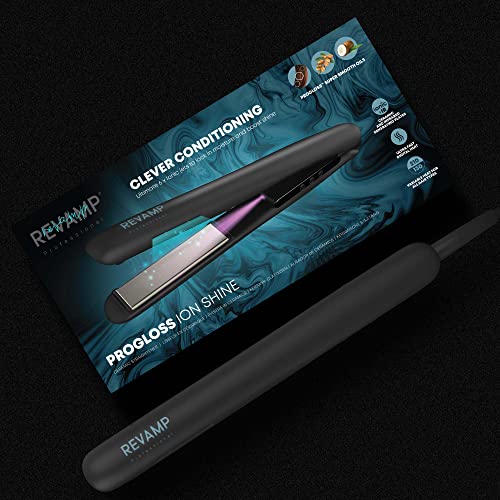 REVAMP Piastra per capelli Progloss Ion Shine in ceramica, con tecnologia agli ioni anti-crespo e oli leviganti Progloss di cheratina, argan e cocco, impostazioni di calore variabili, finitura nera
