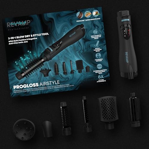 Revamp Spazzola ad Aria Progloss Airstyle 6-in-1, 6 Accessori Intercambiabili, Diverse Impostazioni di Calore e Velocità, Getto Ionico, Infusa in Oli Progloss, con Diffusore e Beccuccio, Nera