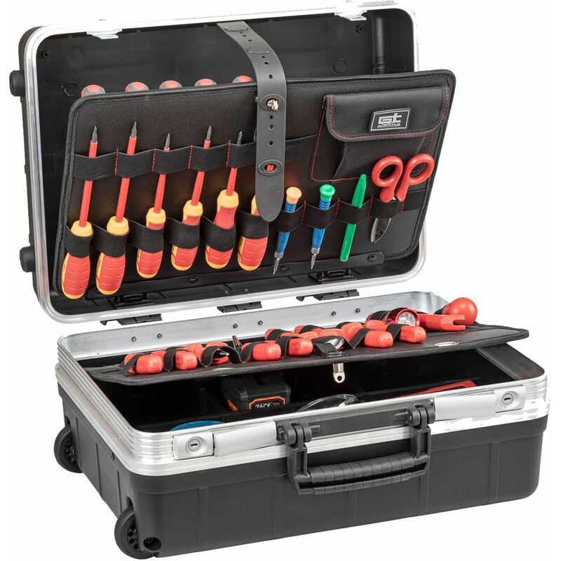 GT Line REVO21 WH PEL è una valigia trolley porta utensili in polipropilene stampata ad iniezione che garantisce un'ottima resistenza alle sostanze corrosive, agli urti e alle alte e basse temperature. GT Line REVO21 WH PEL è progettata 2 serrature con chiave, robusto profilo in alluminio, maniglia telescopica, maniglia ergonomica con grip in gomma, ruote con cuscinetti a sfera, tre cerniere posteriori per una massima tenuta e fondo con divisori removibili e regolabili.I prodotti sono venduti senza utensili. Caratteristiche tecniche Misure interne (LxHxP) 445 x 315 x 190/223 mm Resistente ad alte, basse temperature e agenti chimici Maniglia telescopica Ruote con cuscinetti a sfera Maniglia ergonomica con grip in gomma Robusto profilo in alluminio Peso 5,00 Kg Accessori in Dotazione 2 serrature con chiave 3 cerniere posteriori per una massima tenuta Fondo con divisori removibili e regolabili 2 pannelli porta utensili con elastici (configurazione interna)