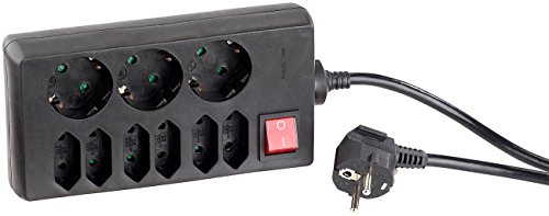 Ciabatta a 9 vie,3 prese Schuko e 6 prese Euro • Ideale anche quando lo spazio è limitato: Cavo di collegamento con spina ad angolo • Carico di corrente massimo: fino a 3500 watt • Dimensioni: 19 x 10 x 4,3 cm