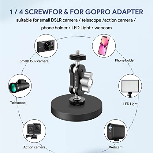 【Morsetto in alluminio regolabile a 360°】La testa sulla parte superiore del supporto magnetico per action camera può essere ruotata di 360 gradi per fornire più angoli di ripresa. La filettatura da 1/4"-20 sulla parte superiore consente di fissare la fotocamera direttamente a uno stabilizzatore o a un foro filettato. Permette di bloccare la fotocamera all'angolo visivo migliore per catturare i vostri scatti migliori.