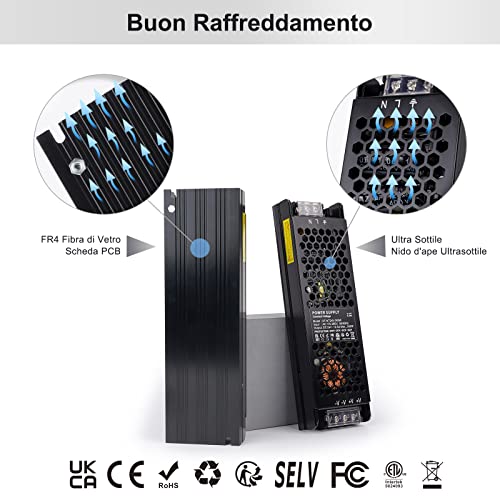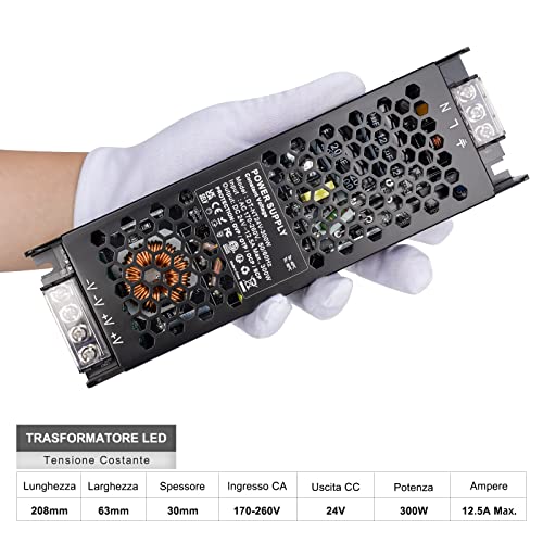 REYLAX Alimentatore LED 24V 300W 12.5A, Slim Trasformatore 220 24V DC Interruttore Adattatore, Trasformatori Tensione Costante, Alimentatore Striscia LED di Bassa Tensione