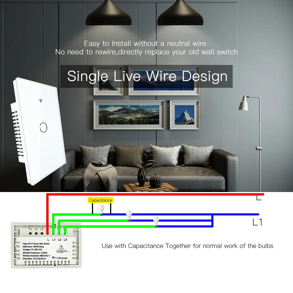 RF433 WiFi Smart Wall Touch Switch No Neutral Wire Needed Smart Single Wire Wall Switch Work with Alexa Google Home 170-250V