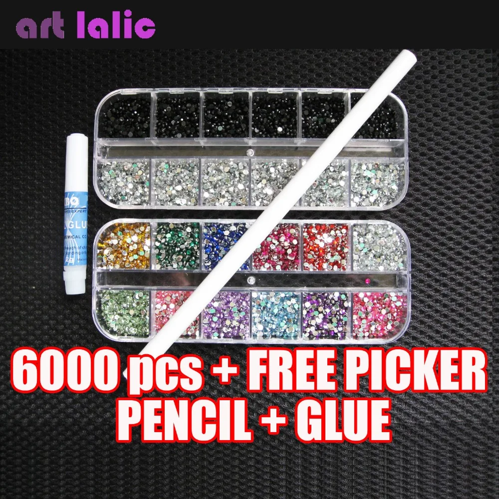 HOT 6000 pcs x 2mm RHINESTONES GEMS FOR NAIL ART DECORATION FREE PICKER PENCIL GLUE