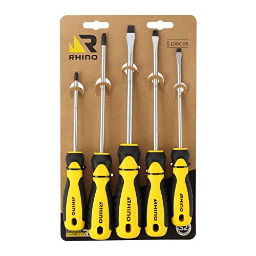 RHINO 16002 - Set di 5 cacciaviti piatti e a croce con lama in acciaio S2 piatto (5 a 8 mm) a croce (PH1/PH2), punta magnetica, uso professionale