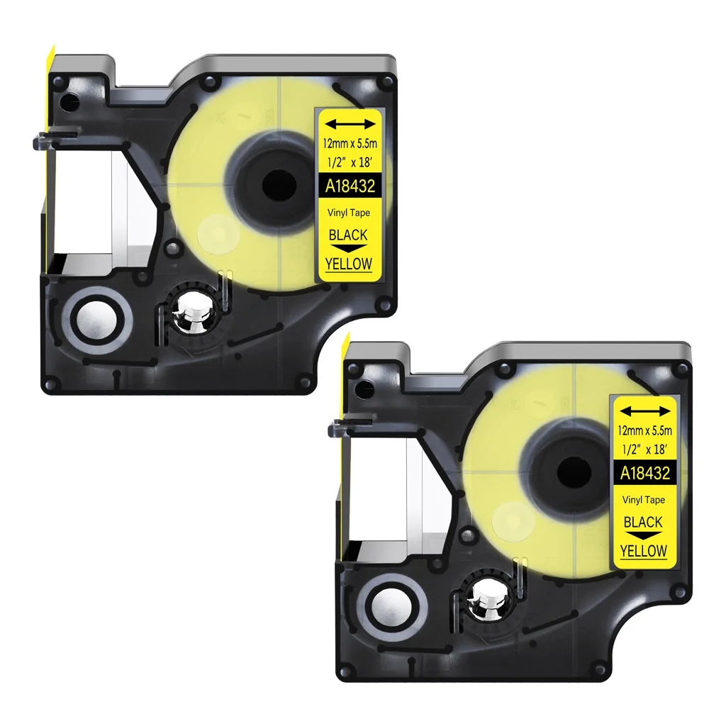 2PK for Dymo Rhino 1000 3000 4200 5000 5200 6000 Industrial IND Vinyl 18432 Labels 1/2" Black on Yellow Tape Cassette 12mm