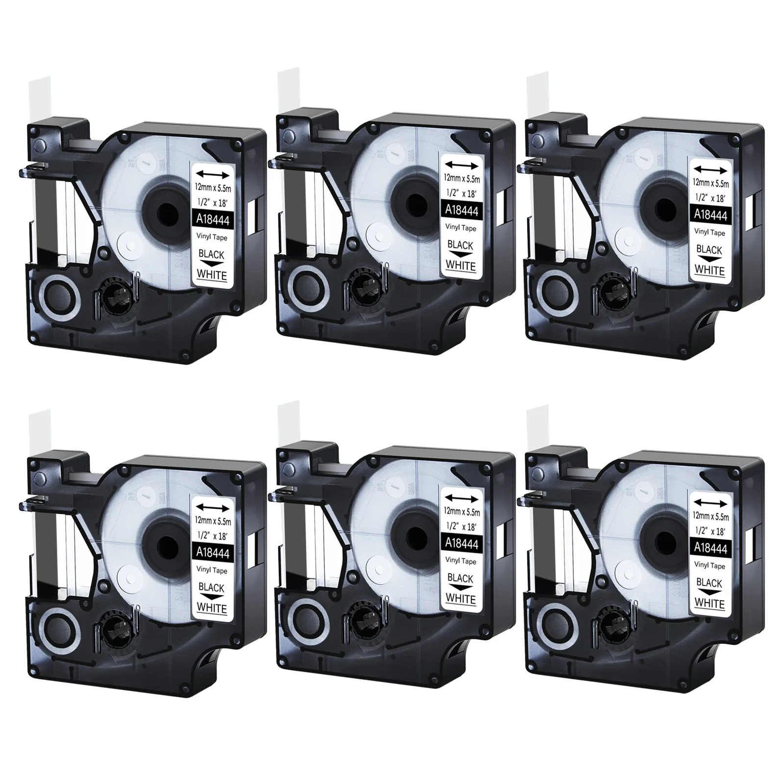 6PK for Dymo Rhino 1000 3000 4200 5000 5200 6000 Industrial IND Vinyl 18444 Labels 1/2" Black on White Tape Cassette 12mm