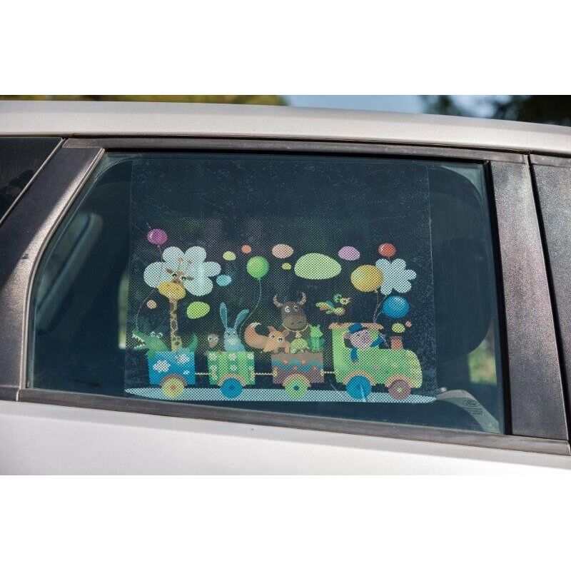 Tendine elettrostatiche riutilizzabili colorate, con sfondo nero. 4 soggetti diversi. 43x38cm. Non impediscono lapertura del finestrino.