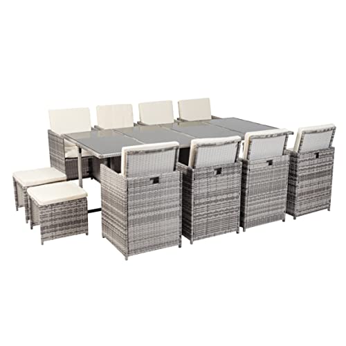 Ribelli Set di mobili da giardino 13 pezzi, set salotto, cuscini - in PE rattan - tavolo più otto sedie e quattro sgabelli pratico da riporre, colorazione:grigio/crema