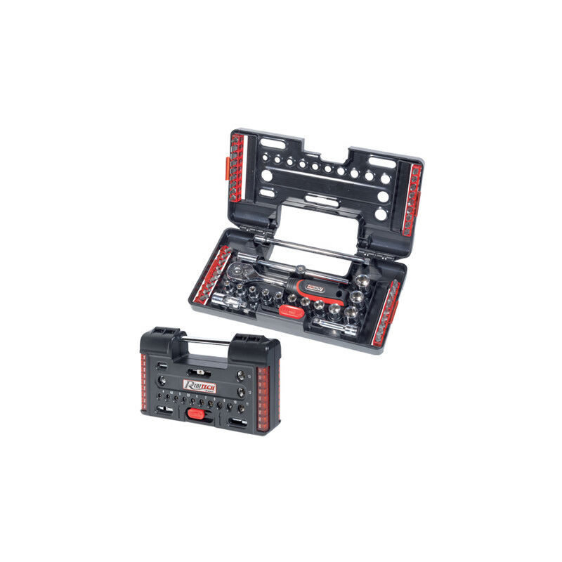 Chiavi a bussola in valigetta 57 pezzi. Il cofanetto comprende: 1 chiave a cricchetto reversibile 1/4 45 denti. - 12 bussole - 1 snodo cardanico - Prolunga L. 50 mm - Prolunga L. 150 mm. Leva a T e 3 chiavi Allen: 1,5-2-2,5 mm. Porta inserti e 36 inserti 25 mm: 8 per viti a taglio, 7 Phillips, 7 Pozidriv, 4 esagonali, 6 Torx, 4 quadrate.