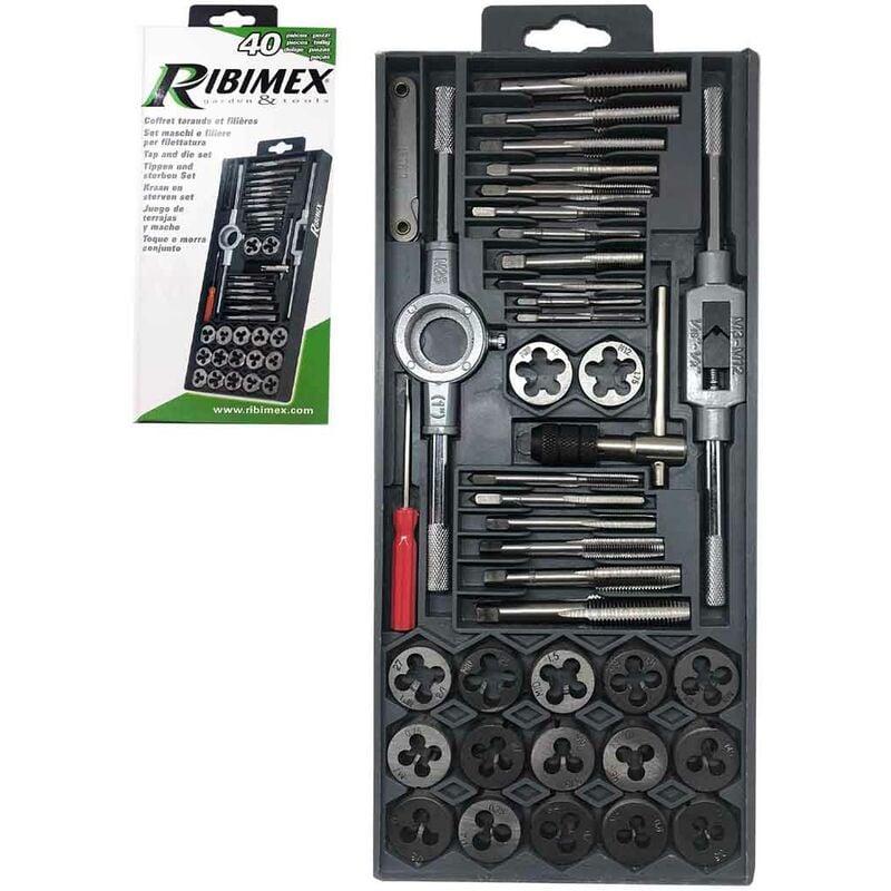 Set filettatrice maschi e filiere in cofanetto da 40 pezzi Il set comprende un cofanetto con: • 1 porta filiera. • 1 Chiave a maschio dritta. • 1 leva a T. • 1 giramaschi regolabile. • 1 cacciavite • 17 filiere: 3x0.5, 3x0.6, 4x0.7, 4x0.75, 5x0.8, 5x0.9, 6x1.0, 6x0.75, 7x1.0, 7x0.75, 8x1.25, 8x1.0, 10x1.5, 10x1.25, 12x1.75, 12x1.5, 1/8-27. • 17 maschi: 3x0.5, 3x0.6, 4x0.7, 4x0.75, 5x0.8, 5x0.9, 6x1.0, 6x0.75, 7x1.0, 7x0.75, 8x1.25, 8x1.0, 10x1.5, 10x1.25, 12x1.75, 12x1.5, 1/8-27.