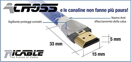 I Conduttori TMDS e HEAC sono in purissimo Rame OFC 99,999% Solid Core da 25 AWG per le lughezze da 1 a 15 metri, mentre per il 20 mt i conduttori sono da 24 AWG. Ricable Across è progettato tutto in Italia, supporta 4K-60Hz, Ultra HD 3D. Pieno supporto anche per HDR Dinamico e ARC.