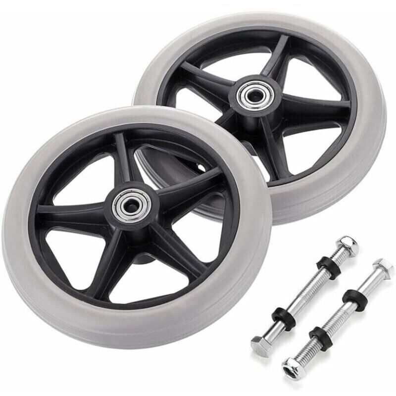 Le dimensioni complessive della ruota (diametro x larghezza) sono 150 mm x 24 mm/5,9 x 0,94, il diametro interno del cuscinetto centrale è 8 mm/0,3 e la lunghezza delle viti è 75 mm/2,95. (Si prega di controllare le dimensioni dettagliate nella terza foto prima dell'acquisto!!) Il pacchetto include 2 ruote di scorta anteriori grigie, 2 assi, facili e convenienti da installare senza passaggi complicati, facilitando l'installazione. risparmiare tempo e fatica. Realizzato in gomma di alta qualità ed ecologica, questo solido set di ruote sostitutive è antiscivolo e antipolvere con forte resistenza all'usura e capacità di carico. Ampia applicazione su veicoli per disabili, veicoli medici, ecc., compatibile con la maggior parte delle sedie a rotelle, deambulatori, deambulatori o altri accessori di ricambio con ruote da 6". Questo set di ricambio della ruota anteriore fornirà una guida silenziosa, fluida e leggera su tutte le superfici, adatto per uso interno ed esterno, economico, pratico