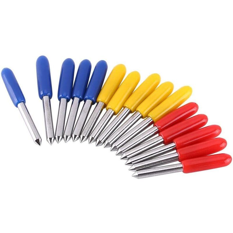 Le lame di taglio sono realizzate in carburo di tungsteno per un'elevata durezza e una lunga durata. Lame di taglio standard per il taglio di supporti adesivi colorati in vinile standard. < p>Viene fornito con supporto, le migliori prestazioni con alta precisione e qualità premium. Viene fornito con cappucci che possono proteggere queste lame per una facile conservazione o trasporto. 3 tipi di gradi per il design generale, il diametro dell'albero di 1,5 mm può essere utilizzato per molti plotter da taglio. Descrizione del prodotto Descrizione: Queste lame da taglio sono le lame standard utilizzate per le taglierine per vinile. Sono consigliati per tutte le colate e i vinili standard, così come altri materiali sottili. ;