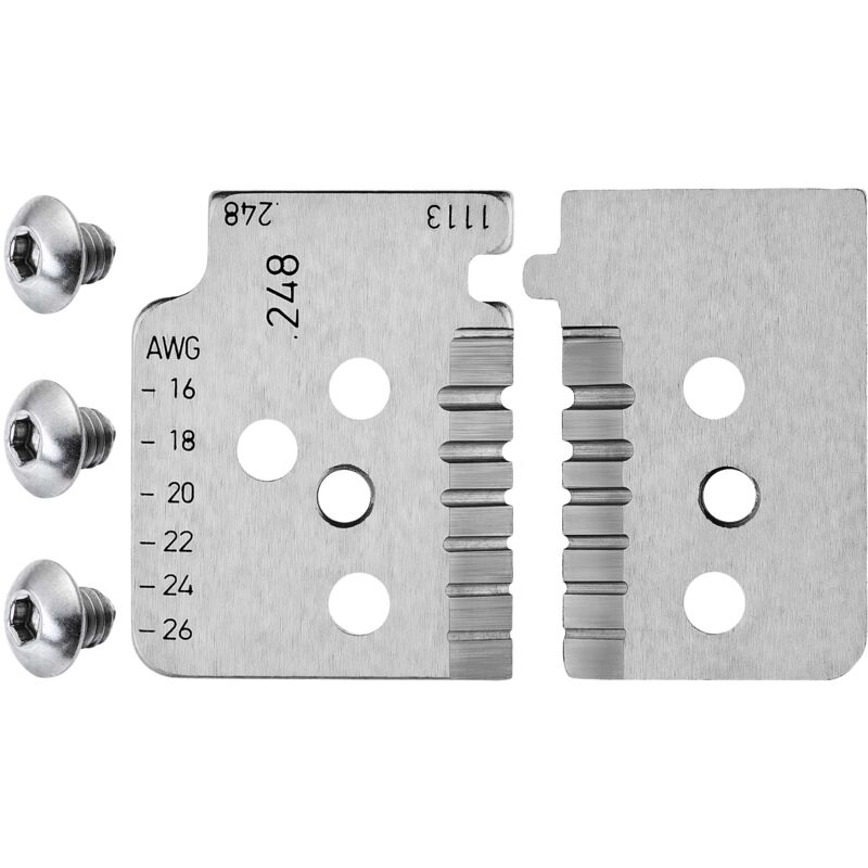12 19 14 1 set di lame di ricambio per 12 12 14 Spelatura ad accoppiamento geometrico anche di materiali isolanti di difficile rimozione in PTFE, silicone, Radox®, Kapton® e gomma anche a più strati. Una seconda coppia di lame mantiene fermo l'isolante residuo. Lame sagomate intercambiabili specificamente adattate alla sezione del cavo. Con staffa di arresto per garantire lunghezze uniformi nei lavori in serie. Kapton® è un marchio registrato di E. I. du Pont de Nemours and Company. Radox® è un marchio registrato di Huber & Suhner AG. - AWG: 16 / 18 / 20 / 22 / 24 / 26 spelatura ad accoppiamento geometrico anche di materiali isolanti di difficile rimozione in PTFE, silicone, Radox®, Kapton® e gomma anche a più strati una seconda coppia di lame mantiene fermo l'isolante residuo lame sagomate intercambiabili specificamente adattate alla sezione del cavo con staffa di arresto per garantire lunghezze uniformi nei lavori in serie RoHS n Peso del tessuto 59 Dimensioni dell'imballaggio 1