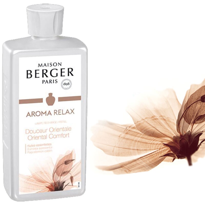 Ricarica Aroma Relax Douceur Orientale 500 ml Maison Berger Ricaricaliquida Aroma Relax fragranza Douceur Orientale per Lampade a catalisi di Maison Berger. Questa fragranza Relax Oriental Comfort della collezione Aroma è una promessa di assoluto relax. Tutto è incentrato sul benessere. Fin dalle prime note, l'ambra e il muschio talcato annunciano le delizie profumate d'Oriente. Il cuore fruttato elegantemente floreale e tenero è delicato e sensuale. La base rotonda di legno di sandalo e ambra è calda e leggermente cremosa. In questa armonia olfattiva può fiorire un trio di oli essenziali accuratamente selezionati: patchouli, legno di guaiaco e geranio dispiegano le loro qualità antistress e antidepressive. La collezione di fragranze per la casa Aroma è la perfetta dimostrazione dell'eccellenza francese, dell'abilità e del know-how dei Maestri Profumieri selezionati dalla Maison Berger Paris. Soddisfa immancabilmente le esigenze di qualità e l'obbligo di un'aria sicura, purificata