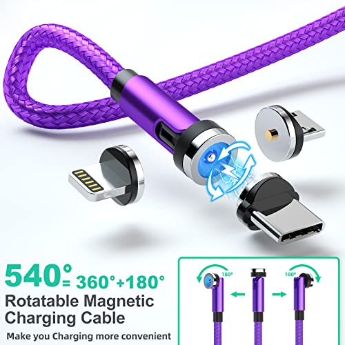 Cavo di ricarica magnetico rotante a 540° [5 pezzi, 3ft/3ft/6ft/6ft/10ft] Cavo di ricarica magnetico 3 in 1 Cavo USB magnetico intrecciato in nylon per dispositivo iPhone/Micro USB/tipo C-Viola