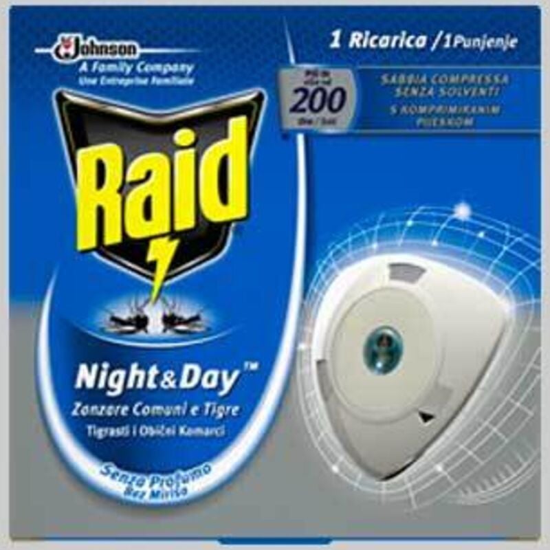 Ricarica di sabbia compressa che diffonde in maniera costante il principio attivo senza additivi. Protezione giorno e notte contro le zanzare comuni (Culex Pipiens), zanzare tigre (Aedes Albopictus) e mosche per 10 giorni. Raid ricarica 'night & day' confezione 1 ricarica JOHNSON Insetticidi