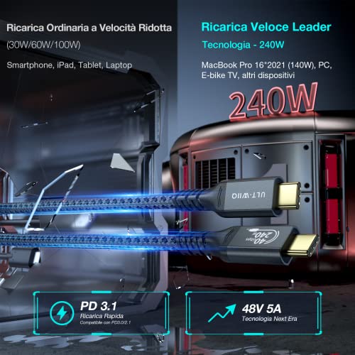 240W: Se abbinato a un caricabatterie compatibile, raggiunge la potenza massima supportata dal dispositivo, con un'alimentazione fino a 240W (48V/5A). Nei prossimi 5-10 anni, questo cavo di ricarica rapida da USBC a USBC sarà in grado di soddisfare completamente le esigenze di ricarica rapida e di ricaricare praticamente qualsiasi dispositivo USB-C, dai telefoni agli accessori, fino ai computer portatili da gioco.