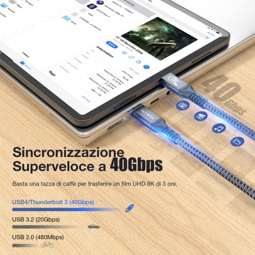 Video UHD Fino a 8K: Con questo cavo USB4 è possibile eseguire lo streaming di contenuti video su un singolo display fino a 8K/6K o su due display in 4K. (È perfetto anche per collegare la docking station o il laptop a un monitor con una risoluzione, un contrasto e una profondità di colore sorprendenti, per non perdere nessun dettaglio.