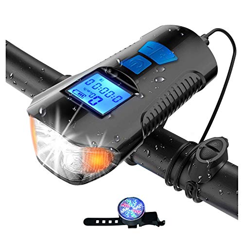 USB ricaricabile Luce per bicicletta, Faro per bicicletta a LED impermeabile con tachimetro e clacson, bicicletta Luce anteriore e posteriore per sicurezza notturna