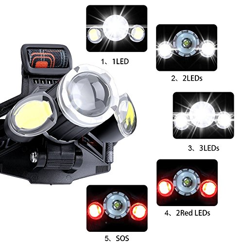 Lampada frontale ricaricabile: dotata di 2 batterie ricaricabili da 3.7V 2500mAh 18650. Dotato di cavo di ricarica USB, tempo di ricarica 9-12 ore, per fornire l'illuminazione più brillante