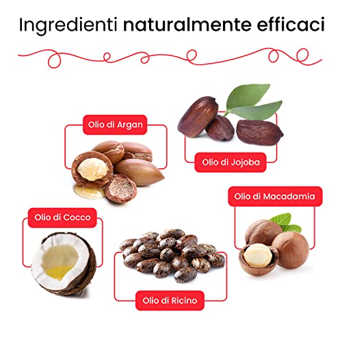 PROPRIETÀ: nel kit sono presenti sostanze funzionali come olio di ricino, olio di cocco, argan, macadamia e jojoba, glicerina, cheratina idrolizzata e collagene idrolizzato