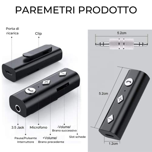Ricevitore Bluetooth Aux 5.0 Portatile - Jack per Musica in Auto, TV, Stereo Cuffie cablate Presa Adattatore Cuffie da 3,5mm Ricevitore Bluetooth Auto Slot Memoria SD TF Esterna Max 64Gb - Fino a 10 M