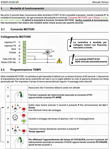 Codici standar da 12 a 64 bit e i codici rolling tipo HCS. Alimentazione 230V relè da 6A, comandi apre e chiude separati. La centrale START-S102 non richiude automaticamente ed è studiata per collegare motori con fine corsa meccanici a bordo (vedi motore tubolare con fine corsa meccanico per tapparelle, tende da sole, schermi avvolgibili).
