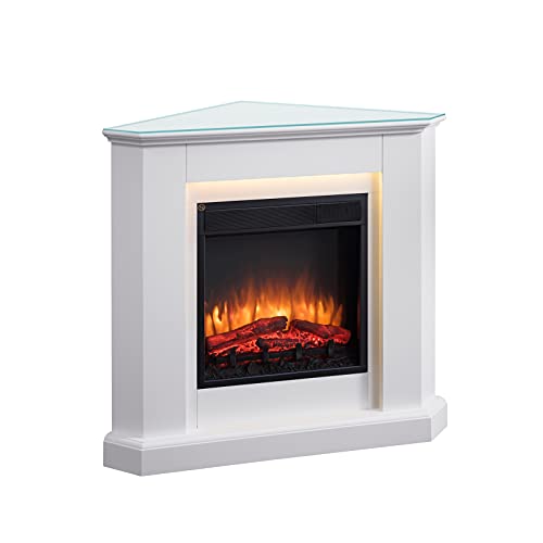 RICHEN Camino elettrico Candela con piastra in vetro - Caminetto elettrico ad angolo, 2000 W, illuminazione a LED, effetto fiamma 3D e telecomando - Bianco