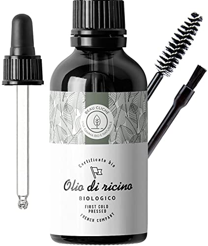 51ml Olio di Ricino Bio, Spremuto a freddo, Puro - Stimola e rafforza la crescita di capelli, barba, ciglia, sopracciglia, unghie, cuticole e pelle - Flacone di vetro, pennellino e spazzolina