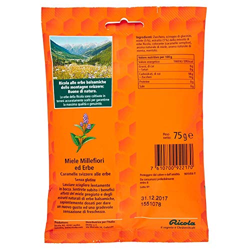 Ricola, Caramelle Balsamiche alle Erbe, Con Zucchero, Gusto Miele Millefiori ed Erbe - Busta da 75g