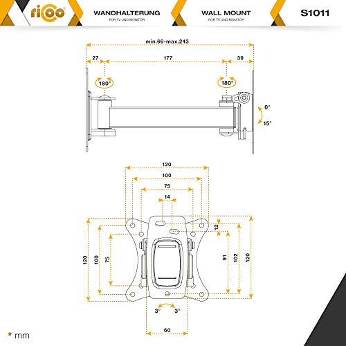 : Porta monitor snodabile per monitor piatto è orientabile 180 gradi, se la larghezza dello schermo è 40cm max. Inclinazione regolabile da +15/-0 gradi. Sostegno con distanza dalla parete da 66-243mm. Il pannello frontal è rotante di +/-3 gradi