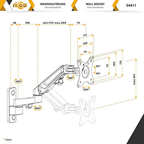 RICOO Supporto monitor muro S4411 Girevole Inclinabile Schermo PC 17-27" (43-69 cm) Staffa TV universale Televisore LED Curvo VESA 75 x 75 100 x 100