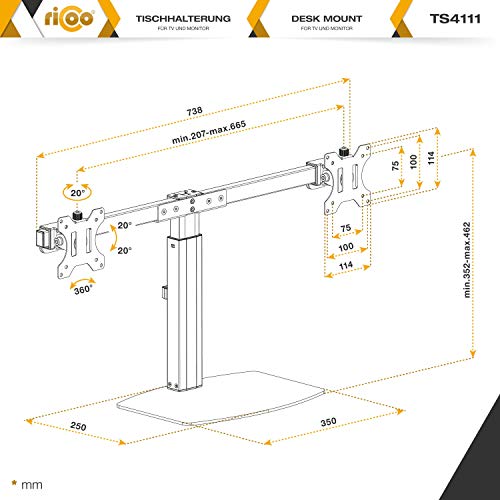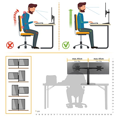 : Stand monitor doppio da tavolo è orientabile +/-10 gradi. Sostegno con inclinazione flessibile da +/-20 gradi. Rotazione de pannello frontale a 360 gradi. Altezza della base è regolabile per molla a gas