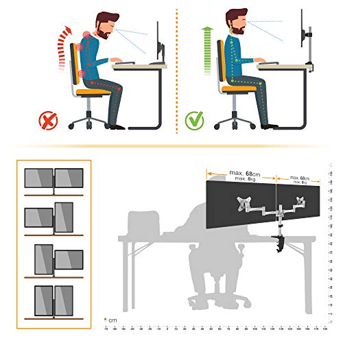 : Stand monitor doppio da tavolo è orientabile 180 gradi. Sostegno con inclinazione flessibile da +/-15 gradi. Rotazione de pannello frontale a 360 gradi. Altezza della base è regolabile