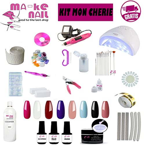 KIT RICOSTRUZIONE UNGHIE MA-KE NAIL IN GEL UV "MON CHERIE" COMPLETO LAMPADA + FRESA PROFESSIONALE + CD CORSO + NAIL ART + PENNELLI + TIPS + ACCESSORI