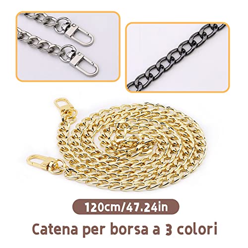 ✦Catena Per Borsa: Otterrai una catena per tracolla di ricambio in 3 colori (oro, argento, nero) e un design con fibbia rotante, la lunghezza della catena è di circa 120 cm e la larghezza è di 10 mm. Può soddisfare le diverse esigenze di collocazione della tua produzione fai-da-te.