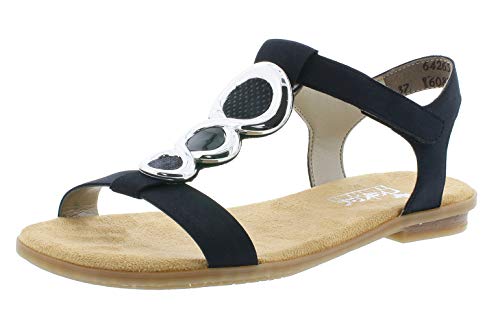 Questa elegante scarpa della marca Rieker è un modello della categoria sandali. Queste scarpe da donna in colore blu convincono grazie al loro design chiaro e sottolineano la moda attuale. Le scarpe grandi di Rieker si combinano perfettamente con lo spirito urbano della moda e conferiscono il tocco giusto a qualsiasi outfit moderno ma anche a un outfit classico e sportivo. Il materiale esterno di questo modello è realizzato in ecopelle, mentre il materiale interno è realizzato in finta pelle