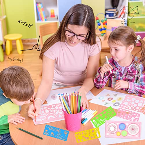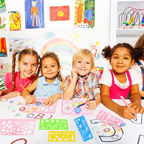 Stencil con regole per bambini: riceverai un set di regole che contiene 2 righelli geometrici multifunzionali, 4 stencil per bambini e un righello spirografo. Ognuno di essi contiene diversi modelli per soddisfare le tue diverse esigenze.